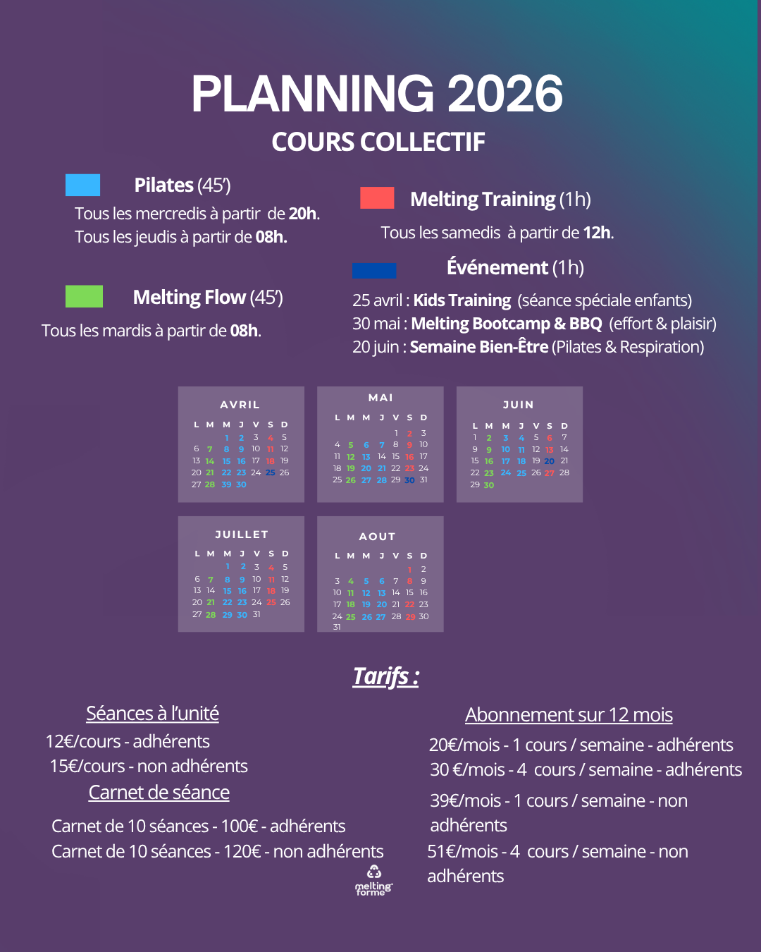 - Melting Training : Les samedis à 12h, voir le planning des jours concernés ( en orange )
